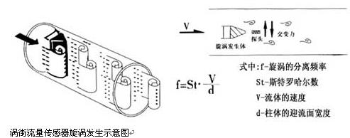 一定雷諾數(shù)范圍內(nèi)(2×104~7×106 ),旋渦的釋放頻率f與流體流速V及旋渦發(fā)生體的迎流面寬度d之間關(guān)系式為f=St•v/d,式中St為斯特勞哈數(shù),它是一個無量綱的系數(shù),只要準(zhǔn)確測出頻率f,就可以求得流體流速v,由v求出體積流量。