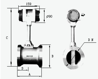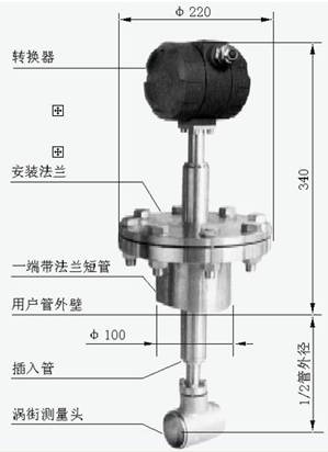 將渦街測量頭插入管道特定位置,通過測量該位置的局部流量,根據(jù)管道截面流速分布關(guān)系,計算出管道內(nèi)平均流速值。它由轉(zhuǎn)換器、插入桿組件、球閥(根據(jù)需求配 )、安裝短管(ф100)、渦街測量頭等組成。
